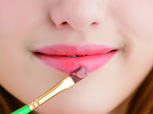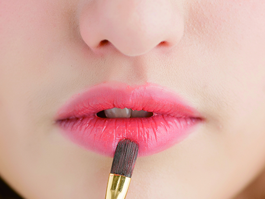 選擇飽和的鮮橘色唇膏,用唇刷沾取先從唇中央內側開始擦上,再用手指稍微暈染色澤。