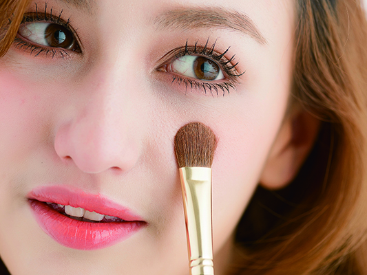 使用大腮紅刷沾取橘色腮紅,橫向刷上鼻翼旁的顴骨處。