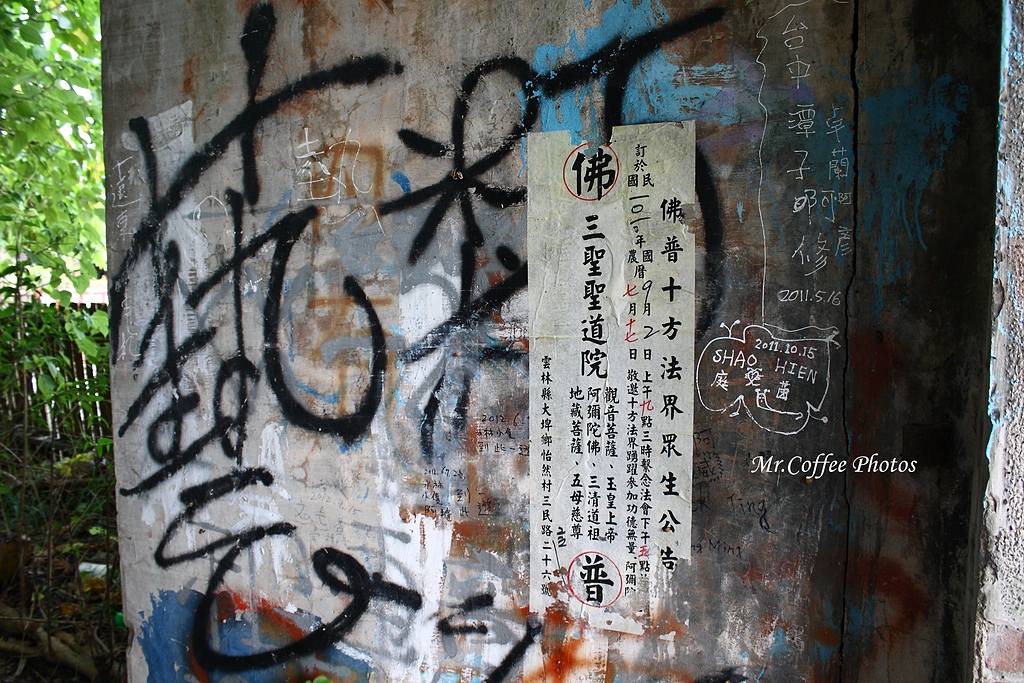 牆上貼了許多「符咒」,看樣子鬼屋真的很兇猛,詳細故事請看 →「民雄鬼屋」