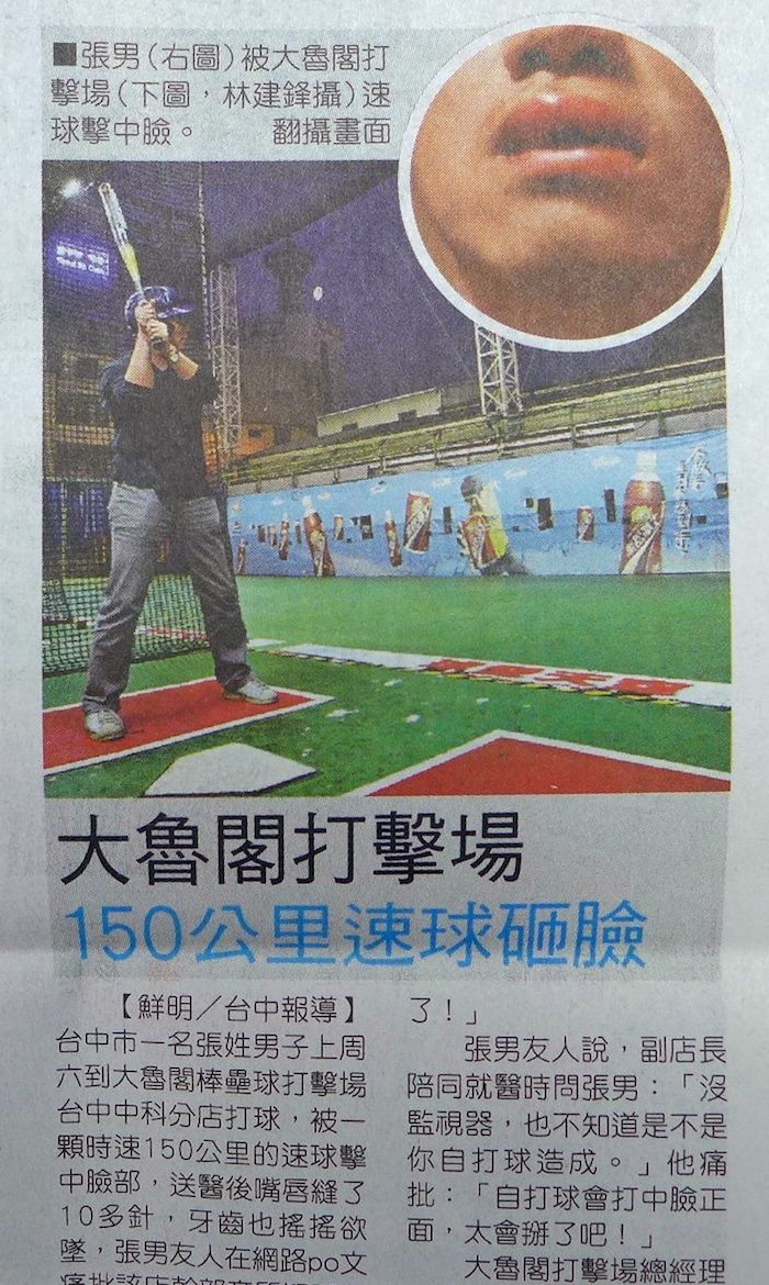 在昨天的《蘋果日報》上,看到台中市有名張姓男子,上週末到大魯閣棒壘球打擊場打球,結果被一顆時速150公里的速球擊中臉部,送醫後不但嘴唇縫了10多針,而且連牙齒也搖搖欲墜。